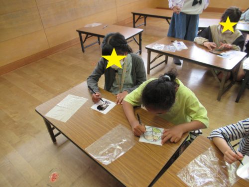 好きな絵柄を選びプラスチック板にマジックで縁取ってから丁寧に絵を塗り、