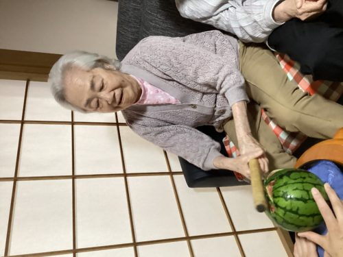 デザートに夏恒例のスイカが届いたので、スイカ割りに挑戦しました。皆さまやさしく叩いてくださるので、もちろん割れず。包丁で切って、召し上がっていただきました。