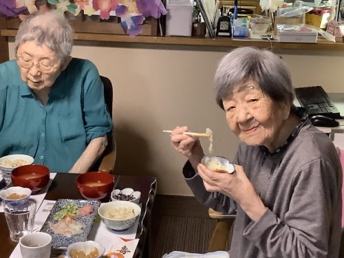 なりこまさんのお造りとキノコご飯を前に、ノンアルビールやノンアルの日本酒で乾杯して祝賀会はスタート。いつもより少し豪華なお食事をゆっくりペースで召し上がっておられました。