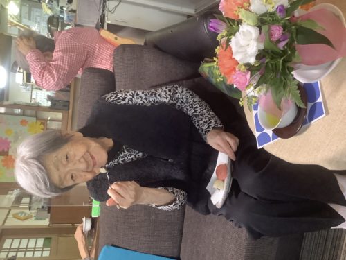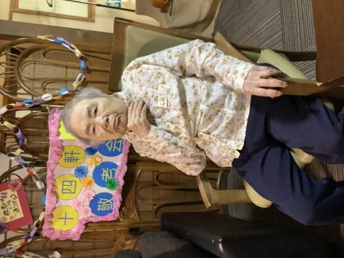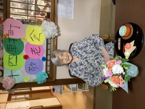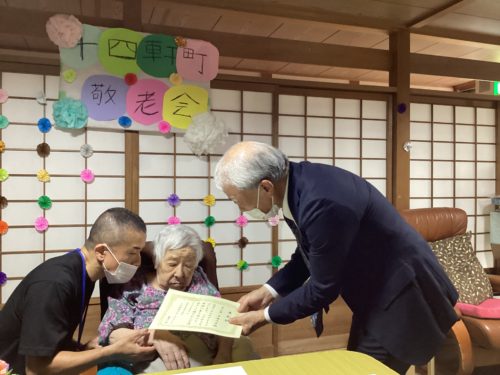 理事長においで頂き、今年は米寿3名、卒寿1名、百三賀1名に表彰状をお渡しすることが出来ました。皆様大変喜んで受け取ってくださいました。