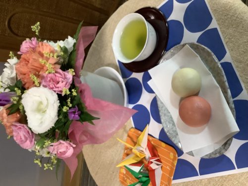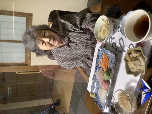 ありがとうございます。昼食は、秋のきのこご飯、刺身盛り、小鉢2品、おやつは紅白まんじゅうを囲んで、和やかな会となりました。