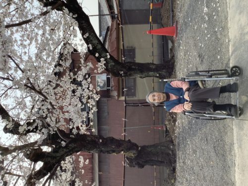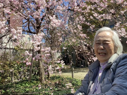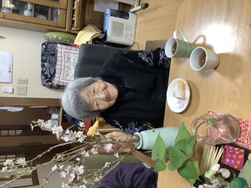 天気の良い日に、近所のお寺へ桜を見に出かけました。「ここの桜はそんなにピンクでもないけど、綺麗やな~。私は、円山公園とか嵐山に良く桜をみにいってた」と思い出話をしながら、楽しく過ごされました。室内にも桜を飾りました。一気に春らしく華やかな雰囲気になりますね。